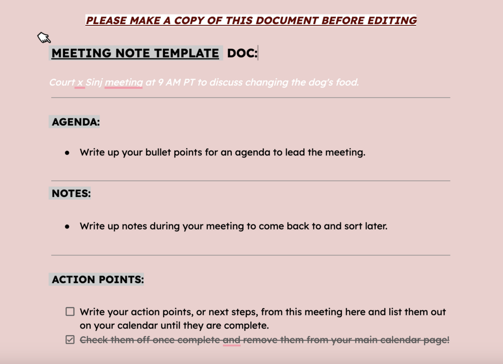 - Pre-formatted sections for meeting details, attendees, and agenda items