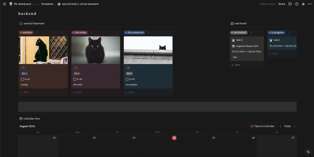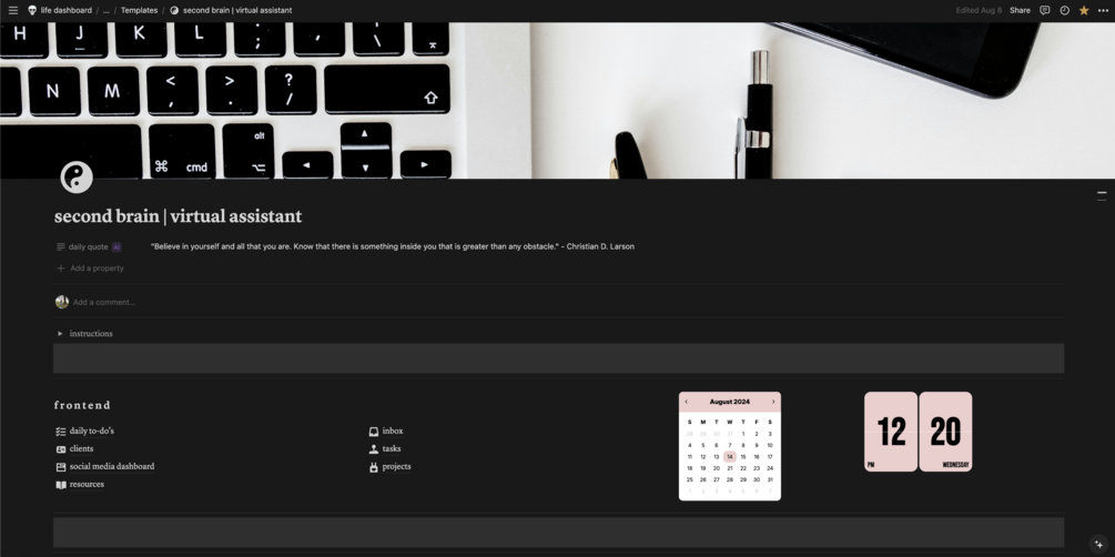 Ready to transform your business from chaotic to coordinated? Dive into this Second Brain Virtual Assistant dashboard and watch your productivity soar faster than you can say 'business growth'! Who knows, you might even have time for that lunch break you've been dreaming about. Let's get organized!
